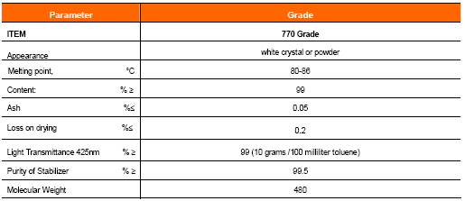 770 is recommended to be used in polypropylene, impact modified PP(TPO), EPDM, polystyrene, impact polystyrene, ABS,SAN,ASA and polyurethanes and is also effective in polyamides and polyacetals.